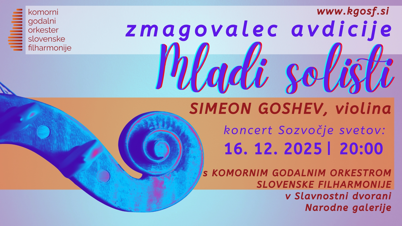 Vabimo vas na koncert, ki bo potekal 16. decembra 2025 v Slavnostni dvorani Narodne galerije v Ljubljani. Zmagovalec Simeon Goshev bo s Komornim godalnim orkestrom Slovenske filharmonije izvedel naslednji deli: